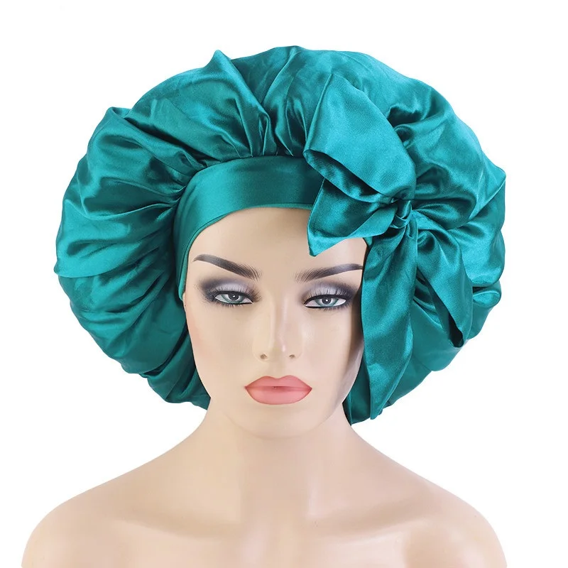 Hot Sale Satin binding rhinestones with Tie Band Double Layer customized Women big size hair Bonnets